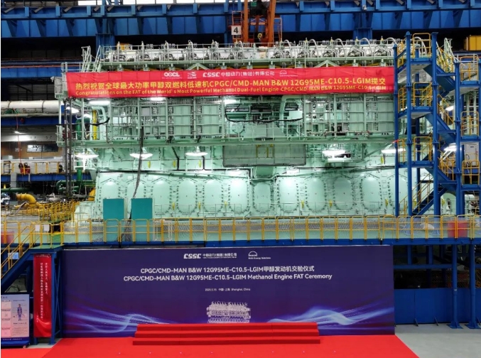 5月15日,中船集團(tuán)旗下中船動(dòng)力與MAN ES聯(lián)合舉辦的CPGC/CMD-MAN B&W 12G95ME-C10.5-LGIM-EGRTC甲醇發(fā)動(dòng)機(jī)工廠驗(yàn)收測試(FAT)交驗(yàn)儀式在中船動(dòng)力下屬中船三井成功舉行。