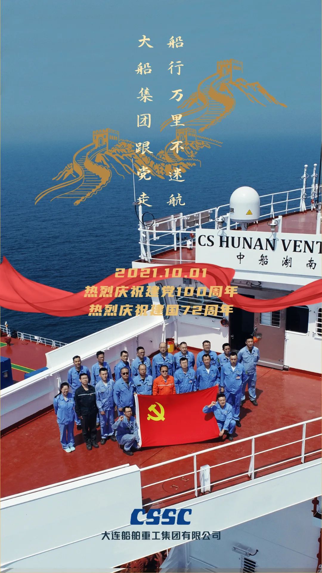 今天,我們迎來新中國72周年華誕。作為我國海軍裝備建設(shè)的主力軍,中國船舶大船集團(tuán)將不忘初心,牢記使命,堅定貫徹海洋強(qiáng)國、制造強(qiáng)國、科技強(qiáng)國國家戰(zhàn)略,聚焦主責(zé)主業(yè)、聚力興裝強(qiáng)軍,為實(shí)現(xiàn)中華民族偉大復(fù)興的中國夢而不懈奮斗。