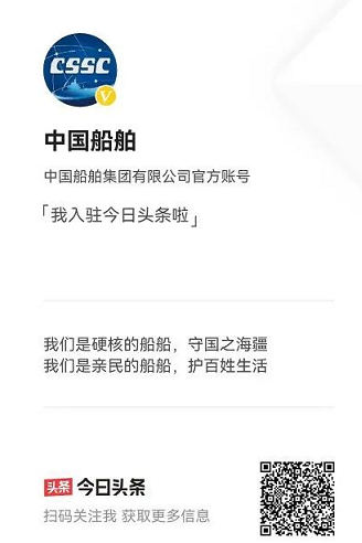 繼中國船舶官方抖音號(hào)之后,中國船舶官方頭條號(hào)今天也正式開通!