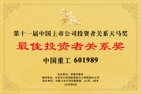 ????中國船舶集團(tuán)旗下中國重工于近日榮獲由證券時(shí)報(bào)社主辦的“第11屆中國上市公司投資者關(guān)系天馬獎(jiǎng)——最佳投資者關(guān)系獎(jiǎng)”,滬深兩市共有100家上市公司獲得該獎(jiǎng)項(xiàng)。