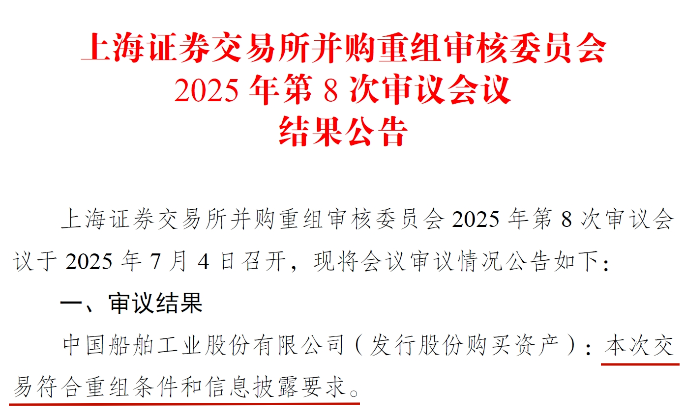 7月4日,上海證券交易所并購(gòu)重組審核委員會(huì)2025年第8次審議會(huì)議召開,審議結(jié)果為中國(guó)船舶工業(yè)股份有限公司(發(fā)行股份購(gòu)買資產(chǎn)):本次交易符合重組條件和信息披露要求。