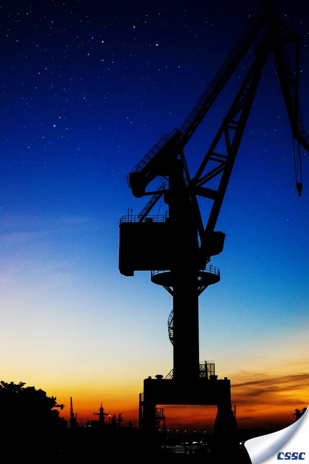 雖與巨輪不同,但船舶生產(chǎn)場地的起重器械亦可稱大國重器。此圖拍攝于2022年2月11日黃埔文沖,恰逢黃昏與星夜交替,器械與船舶共舞。舉起相機(jī)對著夕陽,記錄下這美好的時(shí)刻,以剪影的形式表現(xiàn)工作中的船舶風(fēng)景。