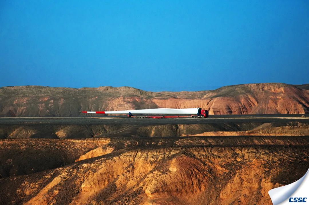 虎年開年, 中國海裝首臺H155-5MW機(jī)組在百里風(fēng)區(qū)——新疆哈密成功完成吊裝,該機(jī)組是新疆哈密目前單機(jī)容量最大的風(fēng)電機(jī)組。圖為超大型風(fēng)葉運(yùn)輸過程的縮影。