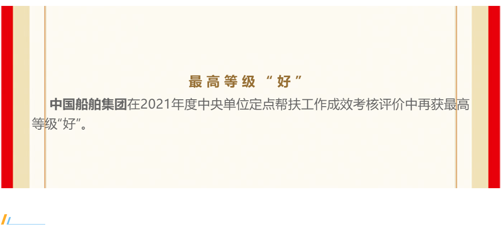 近日,中國船舶集團(tuán)在2021年度中央單位定點幫扶工作成效考核評價中再獲最高等級“好”。這是自2019年組建成立以來,中國船舶集團(tuán)連續(xù)第三年獲“好”。
