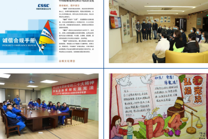 風帆公司、綜合院等單位發(fā)布合規(guī)手冊,組織簽署合規(guī)承諾和合規(guī)考試;中船澄西、投資公司、七一一所、七二六所等單位精心制作并設置憲法宣傳展板;江南造船、中船九院等單位開展憲法法律知識問答,實現(xiàn)以考促學;廣州公司持續(xù)開展“送法進校園”憲法宣傳活動,將法治學習延伸到所屬技校、幼兒園;七一〇所、七一五所等單位開展法律咨詢志愿服務活動,對外樹立良好的“法治形象”;駐香港企業(yè)中船資本、中船租賃大力宣傳憲法及香港基本法、香港國安法,提升員工憲法法治意識。