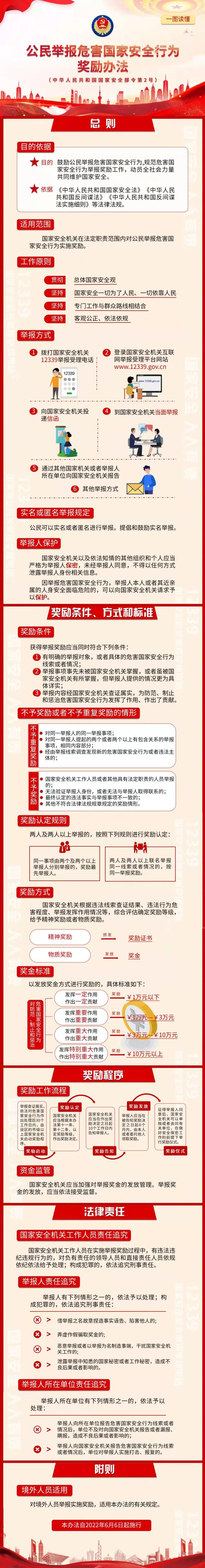 2022年6月6日,國家安全部公布部門規(guī)章《公民舉報(bào)危害國家安全行為獎(jiǎng)勵(lì)辦法》。國家安全一切為了人民,一切依靠人民,讓我們行動(dòng)起來,共做國家安全的守護(hù)人!