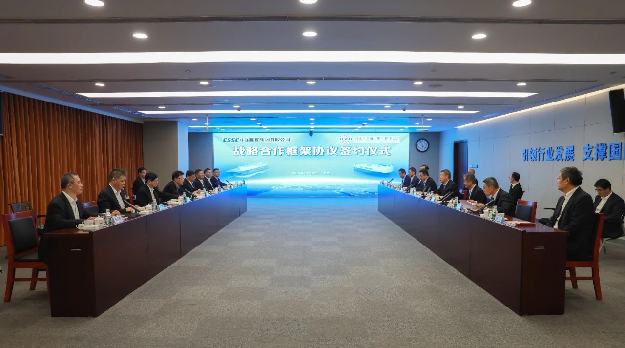 10月15日,中國(guó)船舶集團(tuán)有限公司與中國(guó)遠(yuǎn)洋海運(yùn)集團(tuán)有限公司在上海簽訂戰(zhàn)略合作框架協(xié)議。中國(guó)船舶集團(tuán)黨組書記、董事長(zhǎng)溫剛,中遠(yuǎn)海運(yùn)集團(tuán)黨組書記、董事長(zhǎng)萬敏,黨組副書記、總經(jīng)理朱碧新出席簽約儀式。中國(guó)船舶集團(tuán)黨組成員、副總經(jīng)理盛紀(jì)綱,紀(jì)檢監(jiān)察組組長(zhǎng)、黨組成員彭宏,中遠(yuǎn)海運(yùn)集團(tuán)黨組成員、副總經(jīng)理、總會(huì)計(jì)師孫云飛出席簽約儀式。盛紀(jì)綱和孫云飛分別代表雙方在協(xié)議上簽字。簽約前,雙方就進(jìn)一步加強(qiáng)溝通交流、深化多領(lǐng)域合作進(jìn)行了交流探討。