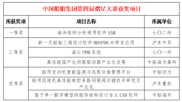 2025年1月3日,國務(wù)院國資委正式公布第四屆中央企業(yè)熠星創(chuàng)新創(chuàng)意大賽獲獎名單。中國船舶集團參賽項目榮獲一等獎1項、三等獎3項、優(yōu)秀獎3項,優(yōu)秀導(dǎo)師4名,集團公司榮獲“優(yōu)秀組織單位”榮譽稱號。