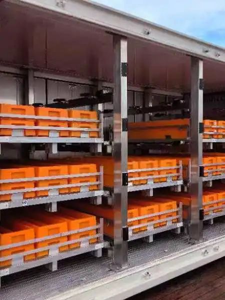 # 露天甲配置了船載巖心集裝箱自動(dòng)裝載系統(tǒng),能夠在集裝箱和電梯之間自動(dòng)轉(zhuǎn)移托盤(pán);