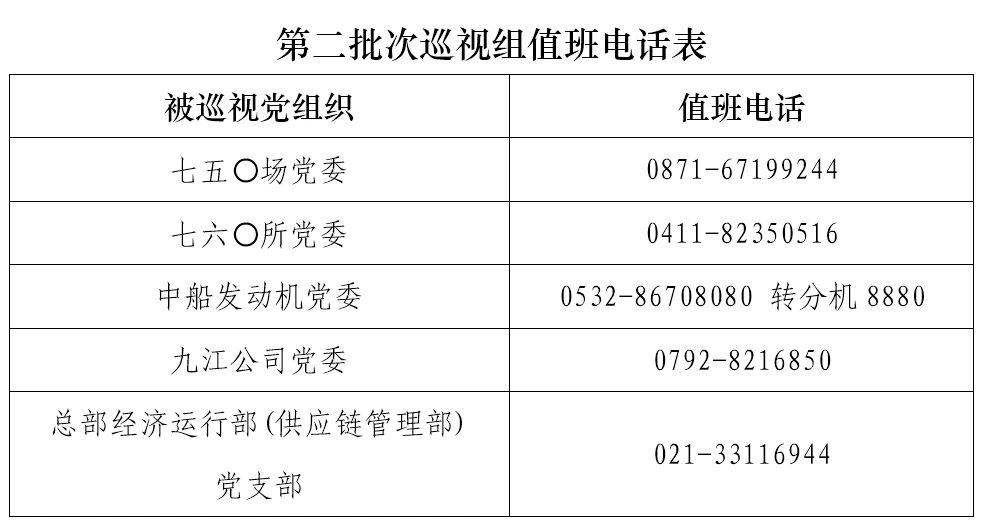 巡視期間,集團公司黨組巡視組設(shè)置值班電話和聯(lián)系信箱,主要受理反映被巡視黨組織領(lǐng)導(dǎo)班子及其成員、下一級黨組織領(lǐng)導(dǎo)班子主要負責人和重點崗位領(lǐng)導(dǎo)干部問題的來信、來電、來訪,重點關(guān)注違反政治紀律、組織紀律、廉潔紀律、群眾紀律、工作紀律、生活紀律以及巡視整改等方面問題反映。第二批次巡視受理信訪截止時間為8月18日。
