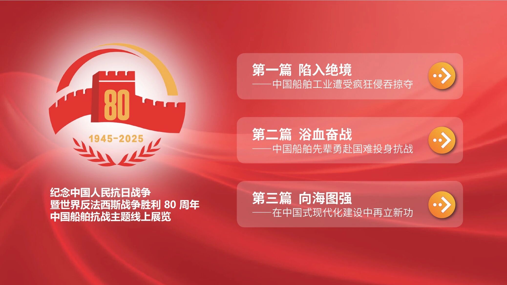 9月4日,在紀(jì)念中國(guó)人民抗日戰(zhàn)爭(zhēng)暨世界反法西斯戰(zhàn)爭(zhēng)勝利80周年之際,中國(guó)船舶集團(tuán)有限公司“追尋紅色記憶 弘揚(yáng)抗戰(zhàn)精神”主題線上展覽上線發(fā)布。