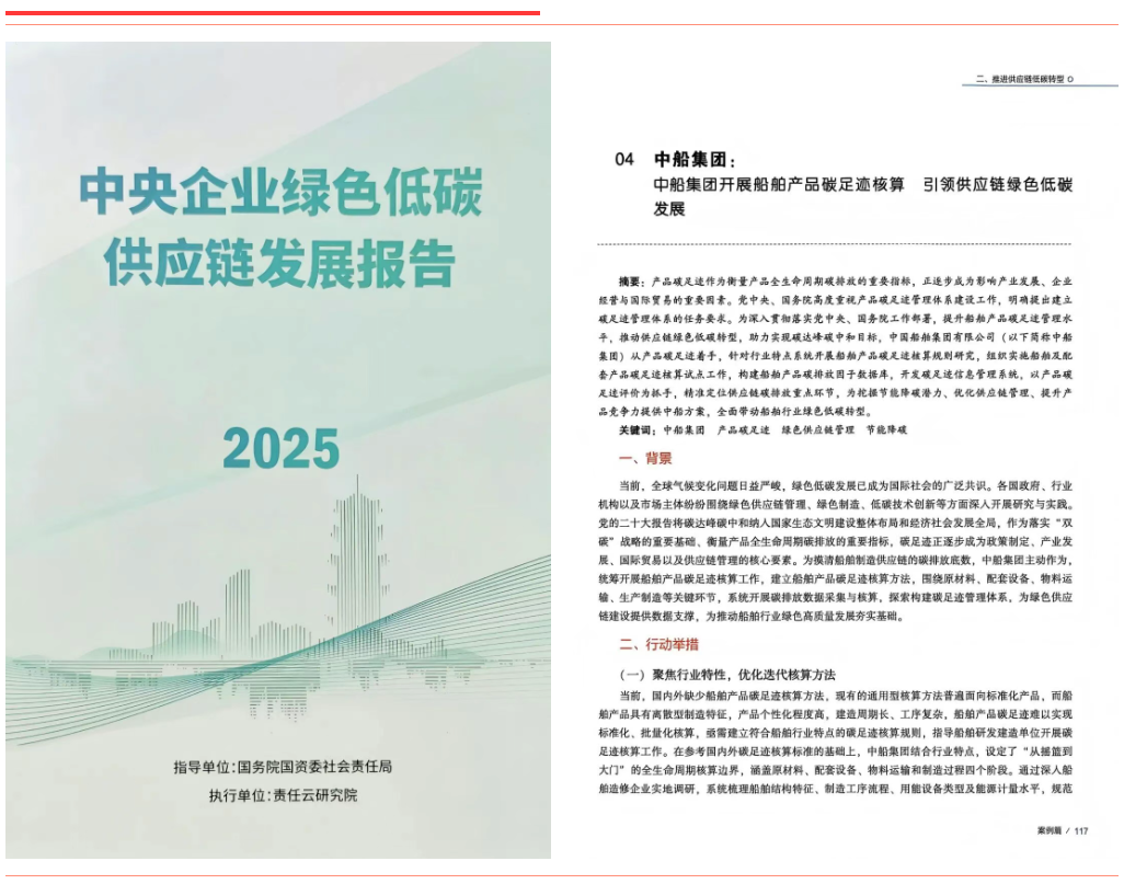 《中船集團(tuán)開展船舶產(chǎn)品碳足跡核算引領(lǐng)綠色供應(yīng)鏈低碳發(fā)展》聚焦船舶產(chǎn)品全生命周期碳足跡核算,構(gòu)建了行業(yè)首套核算規(guī)則與數(shù)據(jù)庫,有效帶動(dòng)供應(yīng)鏈上下游協(xié)同減排。該案例入選《中央企業(yè)綠色低碳供應(yīng)鏈發(fā)展報(bào)告(2025)》。