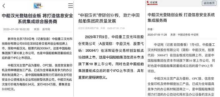 中船漢光成功上市在業(yè)內(nèi)引起強(qiáng)烈反響,新華社、經(jīng)濟(jì)日?qǐng)?bào)以及中國證券報(bào)等主流媒體紛紛進(jìn)行了報(bào)道。
