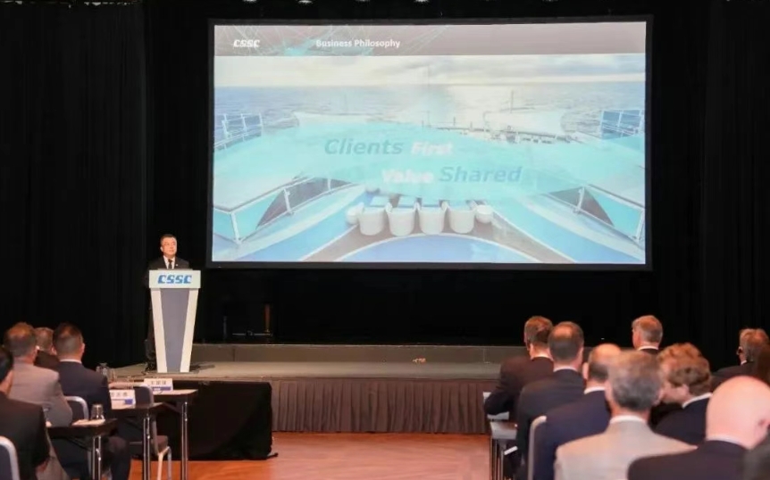 王國強向全球主要船東和合作伙伴宣講了“中船集團 智領深藍”的企業(yè)品牌理念,闡述了中船集團未來十年的“高端化、綠色化、智能化、共享化”戰(zhàn)略規(guī)劃方向,以及與全球廣大船東用戶“開放合作、共創(chuàng)共贏”的經(jīng)營理念。他強調,作為全球船舶市場綠色低碳發(fā)展的引領者、踐行者和先行者,中船集團始終堅持創(chuàng)新驅動的發(fā)展理念,以構建海洋命運共同體為使命,持續(xù)加快核心技術協(xié)同攻關,不斷深化與全球航運企業(yè)及國際海事界的多贏合作。