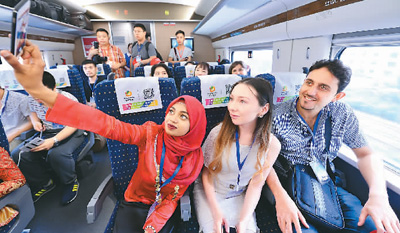 6月17日,100余名留學(xué)生從西安出發(fā),乘坐寶蘭高鐵試運(yùn)行動(dòng)車組前往蘭州,初次體驗(yàn)即將開(kāi)通運(yùn)營(yíng)的首條貫通新絲路高鐵。圖為幾名外國(guó)留學(xué)生在動(dòng)車組試驗(yàn)列車上自拍。唐振江攝(人民視覺(jué))