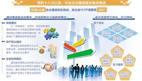 黨的十八大以來(lái),中央企業(yè)的重組整合,成為國(guó)企改革的重要內(nèi)容。5年來(lái),中央企業(yè)的重組整合穩(wěn)步推進(jìn),國(guó)務(wù)院國(guó)資委先后完成18組34家央企重組,央企由117戶調(diào)整至98戶。