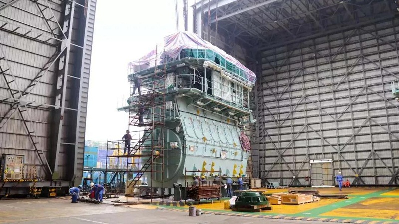 1號(hào)船塢里,4層樓高的主機(jī)吊裝完成