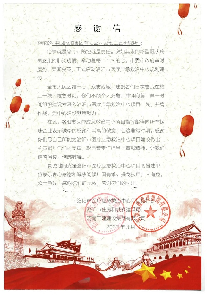 ????近日,中國船舶集團七二五所收到洛陽市醫(yī)療應(yīng)急救治中心項目指揮部發(fā)來的感謝信,中國船舶集團旗下江蘇自動化研究所向英國合作單位寄送慰問函與防疫物資。洛陽市醫(yī)療應(yīng)急救治中心項目指揮部,對七二五所在新冠肺炎疫情期間支援建設(shè),洛陽市醫(yī)療應(yīng)急救治中心項目建設(shè)作出的貢獻表示感謝。
