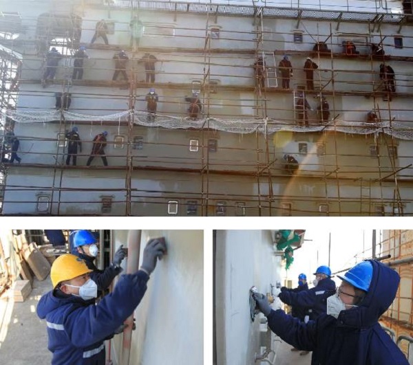 為確保該船按期實現(xiàn)試航節(jié)點,大船集團山船重工先后組織150余名黨員干部投入到該船生活區(qū)外板拉毛工程中。黨員們根據(jù)所分配的區(qū)域,站在十幾米高的腳手架上,手里拿著磨砂紙,一點一點地磨,一塊一塊地蹭,不放過每個細節(jié)。