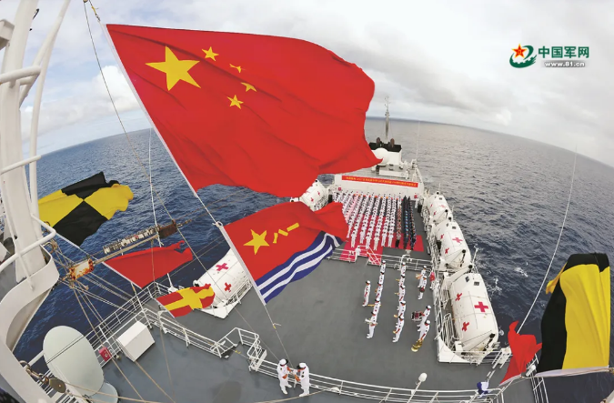 “和平方舟”號(hào)醫(yī)院船在大洋上舉行隆重升旗儀式。來(lái)源:中國(guó)軍網(wǎng) 江 山攝