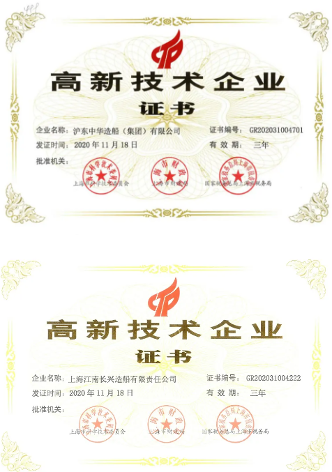 日前,中國船舶集團旗下滬東中華及其控股公司上海江南長興造船有限責(zé)任公司雙雙收到了由上海市科學(xué)技術(shù)委員會、上海市財政局、國家稅務(wù)總局上海市稅務(wù)局聯(lián)合頒發(fā)的高新技術(shù)企業(yè)證書。
