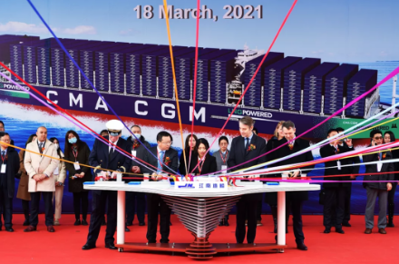 2017年9月,中國船舶集團(tuán)與法國達(dá)飛集團(tuán)簽訂9艘23000TEU超大型雙燃料集裝箱船建造合同。2020年9月,全球首艘23000TEU超大型雙燃料動力集裝箱船“達(dá)飛雅克?薩德”號,在中國船舶集團(tuán)旗下滬東中華命名交付。如今,該系列船交付進(jìn)度已達(dá)2/3,另有1艘氣試歸來,創(chuàng)下系列船最短氣體試航紀(jì)錄。