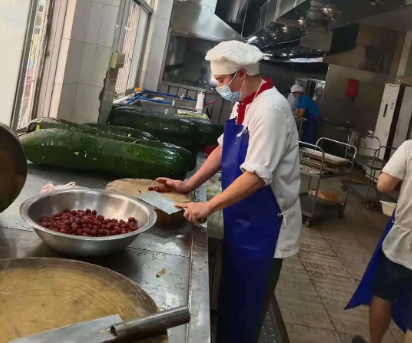 而在技校和養(yǎng)老院的后廚,阮積劍等廚師們同樣已經(jīng)整裝待發(fā)。在社區(qū)封閉初期,飲食服務(wù)部養(yǎng)老院飯?zhí)脝T工由原來的18人劇減至7人。廚師梁志寬面對每日約800人的進餐人數(shù),迎難而上,轉(zhuǎn)變菜式花樣,合理優(yōu)化膳食,注重營養(yǎng)搭配,以嫻熟的廚藝獨自完成后廚大量工作,保證了菜肴準時出品。而廚師、黨員陳兆銘得知飯?zhí)靡蚴芤咔橛绊懚耸謬乐夭蛔?,在試航歸來做完核酸檢測后立即回到養(yǎng)老院飯?zhí)玫膷徫簧?。為此,他直接把“家”安在了養(yǎng)老院,每天睡在簡易折疊床上。