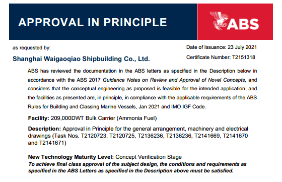 日前,中國(guó)船舶集團(tuán)旗下外高橋造船自主研發(fā)設(shè)計(jì)的21萬噸氨燃料動(dòng)力散貨船獲得美國(guó)船級(jí)社(ABS)頒發(fā)的原則性認(rèn)可證書(AIP)。作為具有潛力的零碳燃料,氨燃料能滿足更加嚴(yán)格的溫室氣體排放要求,是未來脫碳航運(yùn)業(yè)中最有希望的替代燃料之一。氨燃料動(dòng)力船型的推出,為航運(yùn)業(yè)提供一種零碳運(yùn)輸?shù)沫h(huán)保新方案。