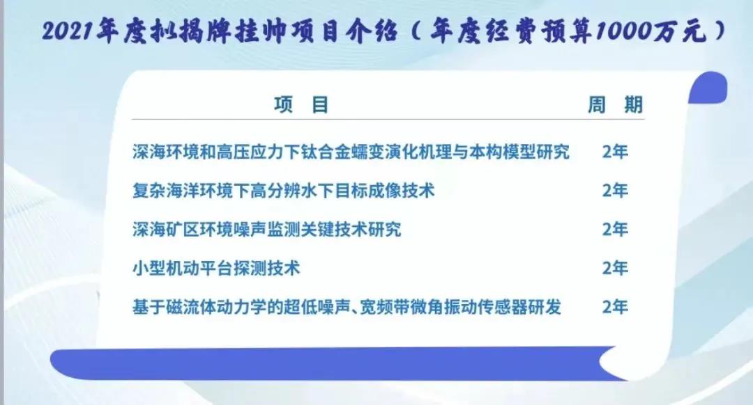 本次5個(gè)揭榜掛帥項(xiàng)目分別為:深海環(huán)境和高壓應(yīng)力下鈦合金蠕變演化機(jī)理與本構(gòu)模型研究、復(fù)雜海洋環(huán)境下高分辨水下目標(biāo)成像技術(shù)、深海礦區(qū)環(huán)境噪聲監(jiān)測關(guān)鍵技術(shù)研究、小型機(jī)動(dòng)平臺(tái)探測技術(shù)、基于磁流體動(dòng)力學(xué)的超低噪聲、寬頻帶微角振動(dòng)傳感器研發(fā)。