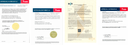 從左至右依次為21萬噸紐卡斯爾型甲醇燃料動力散貨船、9200車雙燃料動力汽車運輸船(PCTC)、創(chuàng)新型30萬噸原油輪(VLCC)、115萬載重噸氨燃料油輪的AIP證書