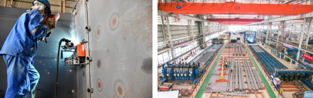 # 在橋位附近部署鋼箱梁拼裝場(chǎng)地,布置4條鋼箱梁智能焊接生產(chǎn)線、4間智能涂裝生產(chǎn)線、120畝存梁場(chǎng)地和深水碼頭,保證鋼箱梁的總拼和存梁及發(fā)運(yùn)需求。
