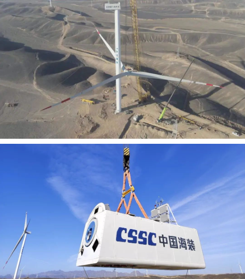 該一體化項目位于全國有名的“百里風(fēng)區(qū)”——新疆哈密市伊州區(qū)十三間房區(qū)域,項目占地面積約231平方公里,是目前哈密市單體裝機規(guī)模最大的風(fēng)儲一體化項目。共安裝150臺中船海裝H176-6.7兆瓦風(fēng)電機組和中船風(fēng)帆生產(chǎn)的30萬千瓦/120萬千瓦時的電化學(xué)儲能裝置。