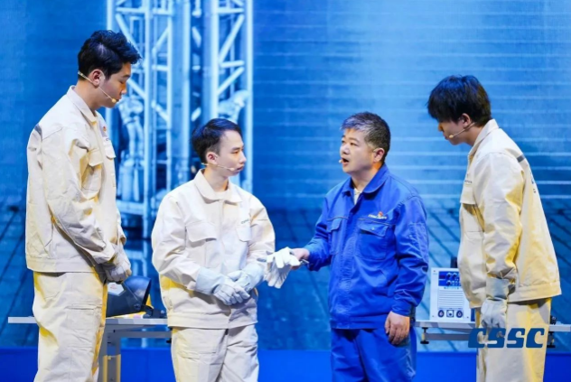 現(xiàn)場,來自中國船船集團江南造船(集團)有限責任公司、滬東中華造船(集團)有限公司、上海外高橋造船有限公司、中船動力(集團)有限公司和中國船舶集團公司第七〇二研究所的青年職工將真實工作案例與理論原文結合,將“發(fā)展新質生產(chǎn)力”作為工作方向與指引,將他們的造船故事親身演繹。故事從《船舶青年說》起航,共講述了五大篇章,分別為江南造船如何延續(xù)百年初心、滬東中華造船LNG船毫厘鑄匠心、七〇二所從“蛟龍”號到“奮斗者”號將深潛進行到底、外高橋造船“愛達?魔都號”大型郵輪“4個120天”的極限挑戰(zhàn)、江南造船“鋼鐵心臟”工程師攻克大型作戰(zhàn)艦建造的不凡創(chuàng)新路,臺詞鏗鏘有力、情感真摯流淌,繪就了一幅精彩的中國船舶夢畫卷。