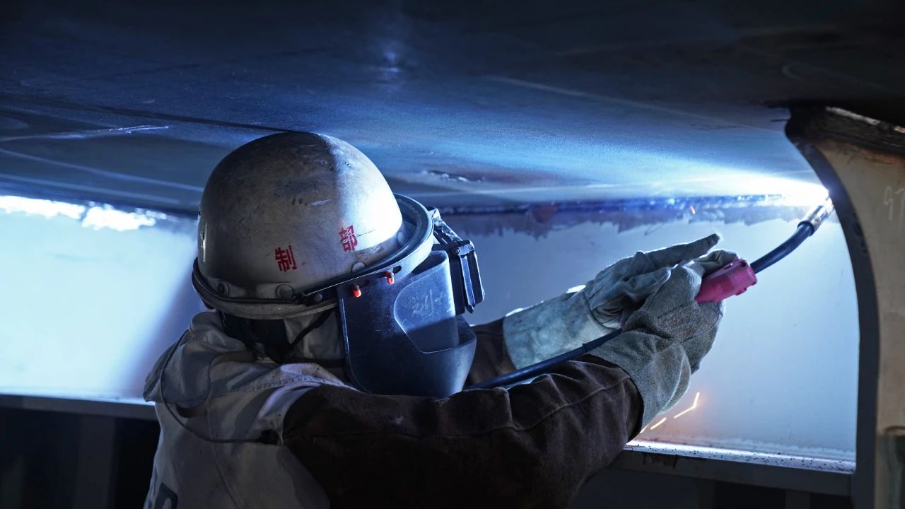 武漢船機(jī)——鋼構(gòu)制造部員工穿著厚厚的防護(hù)服進(jìn)行焊接工作。