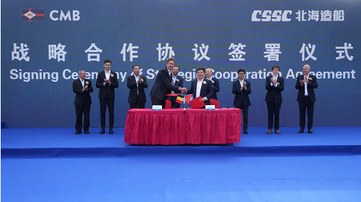 北海造船與比利時(shí)CMB.TECH公司簽署戰(zhàn)略合作協(xié)議。雙方將秉持優(yōu)勢(shì)互補(bǔ)、互利共贏的態(tài)度,持續(xù)拓展合作深度與廣度,聚焦市場(chǎng)推出綠色燃料船,共同研發(fā)低碳和零排放技術(shù),為打造國(guó)際綠色航運(yùn)新生態(tài)作出更大貢獻(xiàn)。