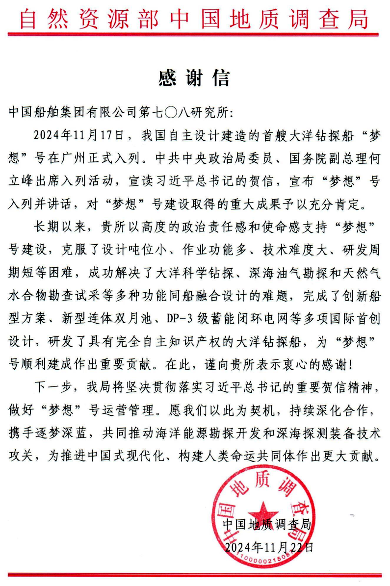 中國地質(zhì)調(diào)查局在信中對中國船舶集團(tuán)七〇八所在“夢想”號立項論證、研發(fā)設(shè)計、建造調(diào)試等階段所做的突出工作和卓越貢獻(xiàn)表示感謝。
