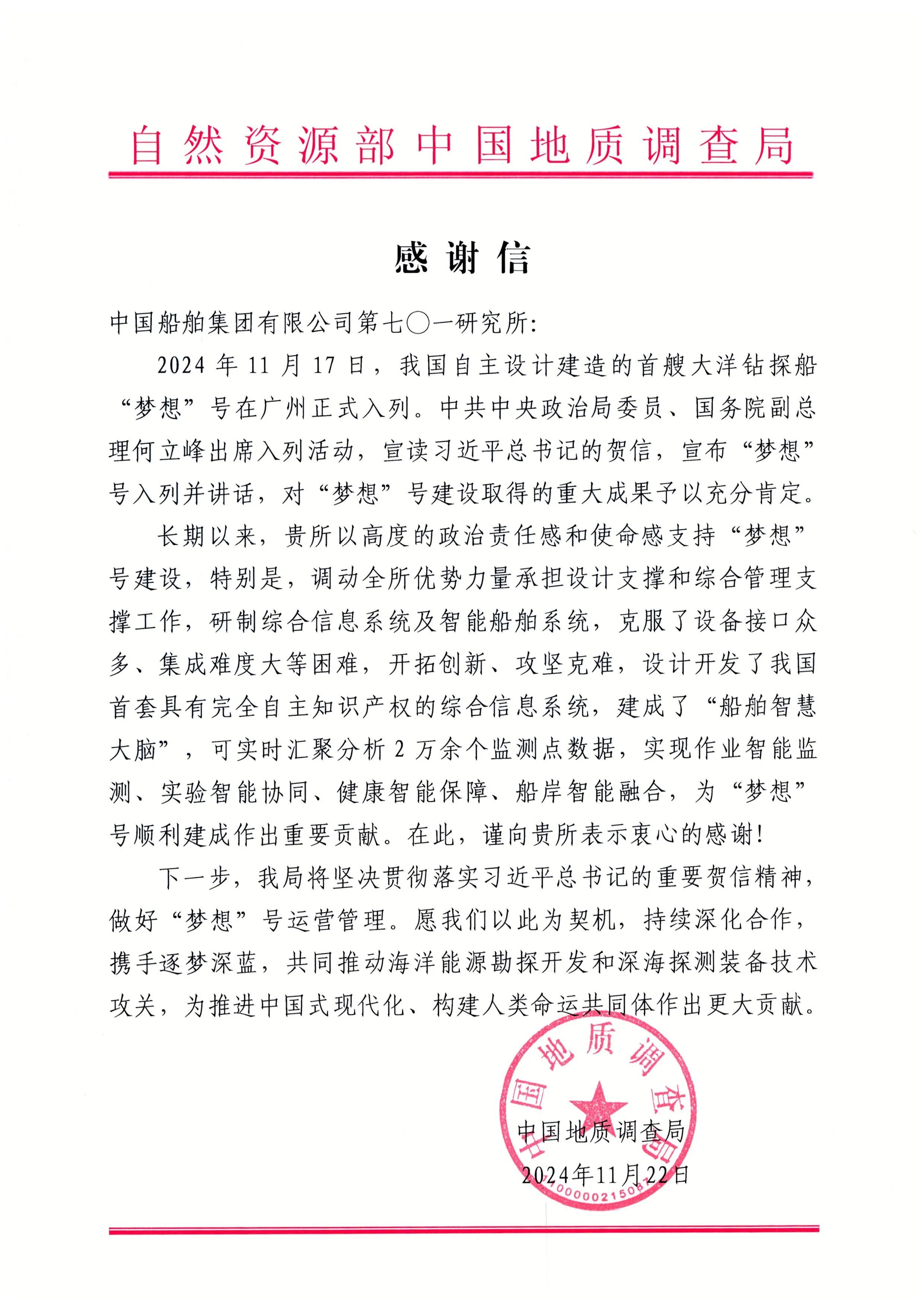 中國地質(zhì)調(diào)查局在信中對中國船舶集團(tuán)七〇一所在“夢想”號設(shè)計支撐和綜合管理支撐、綜合信息系統(tǒng)及智能船舶系統(tǒng)研制等方面所做的重要貢獻(xiàn)表示感謝。