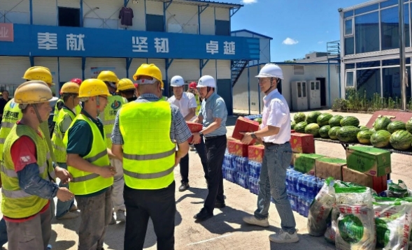 中船國際工程在項目現(xiàn)場開展綜合檢查工作,并向堅守崗位的項目員工及勞務隊伍送上防暑降溫物資,叮囑大家要科學合理安排作業(yè)時間,切實做好防暑降溫措施。