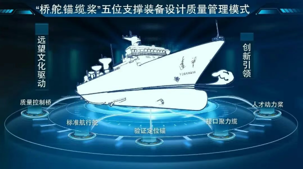 基于“全自主研發(fā)”和“巨系統(tǒng)抓總”的問題導(dǎo)向,七〇八所“遠(yuǎn)望”研發(fā)創(chuàng)新團(tuán)隊(duì)凝聚智慧和力量,以創(chuàng)新為引領(lǐng)、以遠(yuǎn)望文化為驅(qū)動(dòng),提煉了“橋、舵、錨、纜、槳”五位支撐裝備設(shè)計(jì)質(zhì)量管理模式。各項(xiàng)核心管理要素相互作用、五位支撐裝備研發(fā)設(shè)計(jì)過程,構(gòu)建形成了一個(gè)良好向上、持續(xù)提升的團(tuán)隊(duì)質(zhì)量管理機(jī)制,為確保裝備研制質(zhì)量奠定了堅(jiān)實(shí)基礎(chǔ)?!皹颉笔恰芭灅颉钡暮?jiǎn)稱,是艦船駕駛控制、觀察及決策的主要設(shè)施,其作用如同質(zhì)量控制?!岸妗笔强刂婆灤叫蟹较虻闹饕O(shè)備,其作用如同規(guī)范指引?!板^”作為艦船停泊和定位的主要設(shè)備,其作用如同試驗(yàn)驗(yàn)證?!袄|”作為艦船靠幫連接的主要設(shè)備,其作用如同接口管理?!皹笔翘峁┡灤叫袆?dòng)力的主要設(shè)備,其作用如同人才保障。