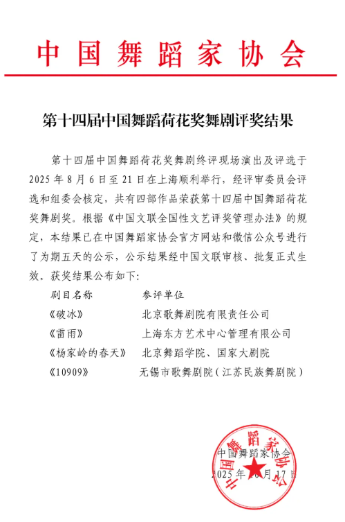 近日,第十四屆中國(guó)舞蹈荷花獎(jiǎng)舞劇獎(jiǎng)評(píng)選結(jié)果揭曉,由無(wú)錫市歌舞劇院與中國(guó)船舶集團(tuán)有限公司旗下第七〇二研究所聯(lián)合創(chuàng)作的原創(chuàng)舞劇《10909》從眾多優(yōu)秀作品中脫穎而出,成功摘得荷花獎(jiǎng)舞劇獎(jiǎng)。