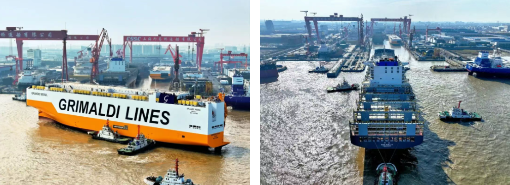 12月16日,中國船舶集團(tuán)有限公司旗下外高橋造船建造的9000車汽車運(yùn)輸船H1608和7000TEU集裝箱船H1353從一號(hào)船塢出塢。至此,外高橋造船實(shí)現(xiàn)了一號(hào)船塢、二號(hào)船塢年度各八批次、共計(jì)24艘船舶的出塢任務(wù),在超額完成年度交船目標(biāo)的基礎(chǔ)上,以領(lǐng)跑姿態(tài)圓滿完成“十四五”收官,順利開啟“十五五”新征程。