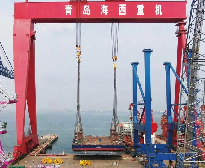 ????在該項(xiàng)目的前期建造策劃階段,海西重機(jī)沒有采用常規(guī)船塢下水或滑移下水方式,而是大膽提出利用1600噸龍門吊整體吊裝下水的設(shè)想。經(jīng)過一系列重量預(yù)估及方案論證,最終核定吊裝下水重量接近1440噸。