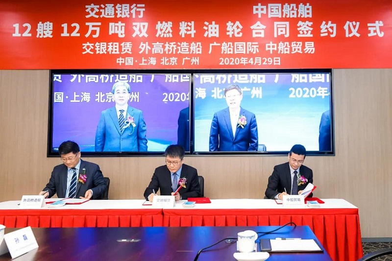 ????4月29日,中國船舶集團(tuán)有限公司旗下中國船舶工業(yè)貿(mào)易有限公司、上海外高橋造船有限公司、廣船國際有限公司與交通銀行股份有限公司旗下交銀金融租賃有限責(zé)任公司在北京、上海、廣州三地以“云簽約”方式簽署12艘12萬噸雙燃料油船建造合同,合同總金額約46億元人民幣,這是中國船舶集團(tuán)旗下單位近期承接的又一單筆大額訂單。中國船舶集團(tuán)黨組書記、董事長雷凡培,交通銀行黨委書記、董事長任德奇,中國船舶集團(tuán)黨組成員、副總經(jīng)理孫偉,交通銀行黨委委員、副行長呂家進(jìn)出席簽約儀式。