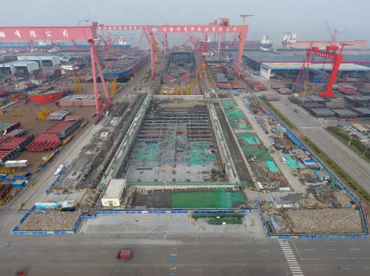 ——第二次改造,2018年10月至2020年6月,再次接長200米,建成后總長達740米。通過中間塢門分別形成前后兩個獨立塢室,以滿足年產(chǎn)1.5艘大型郵輪及3艘VLCC綱領(lǐng)產(chǎn)品要求。