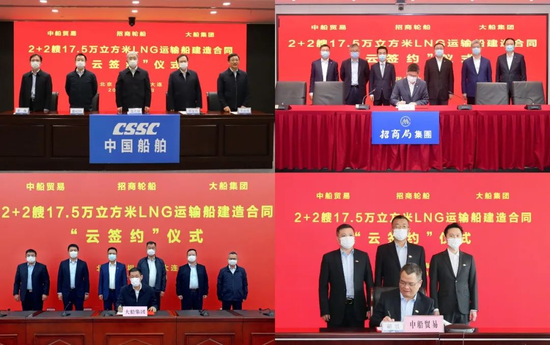 3月31日,中國船舶集團(tuán)有限公司旗下大船集團(tuán)聯(lián)合中船貿(mào)易與招商局集團(tuán)有限公司旗下招商輪船在上海、深圳、大連及北京四地以“云簽約”方式簽署2+2艘17.5萬立方米大型液化天然氣(LNG)運(yùn)輸船建造合同。中國船舶集團(tuán)黨組書記、董事長雷凡培,黨組副書記、總經(jīng)理?xiàng)罱鸪桑h組成員、副總經(jīng)理盛紀(jì)綱,招商局集團(tuán)董事長繆建民、總經(jīng)理胡建華、董事王宏出席簽約儀式。雷凡培、繆建民在儀式上致辭。