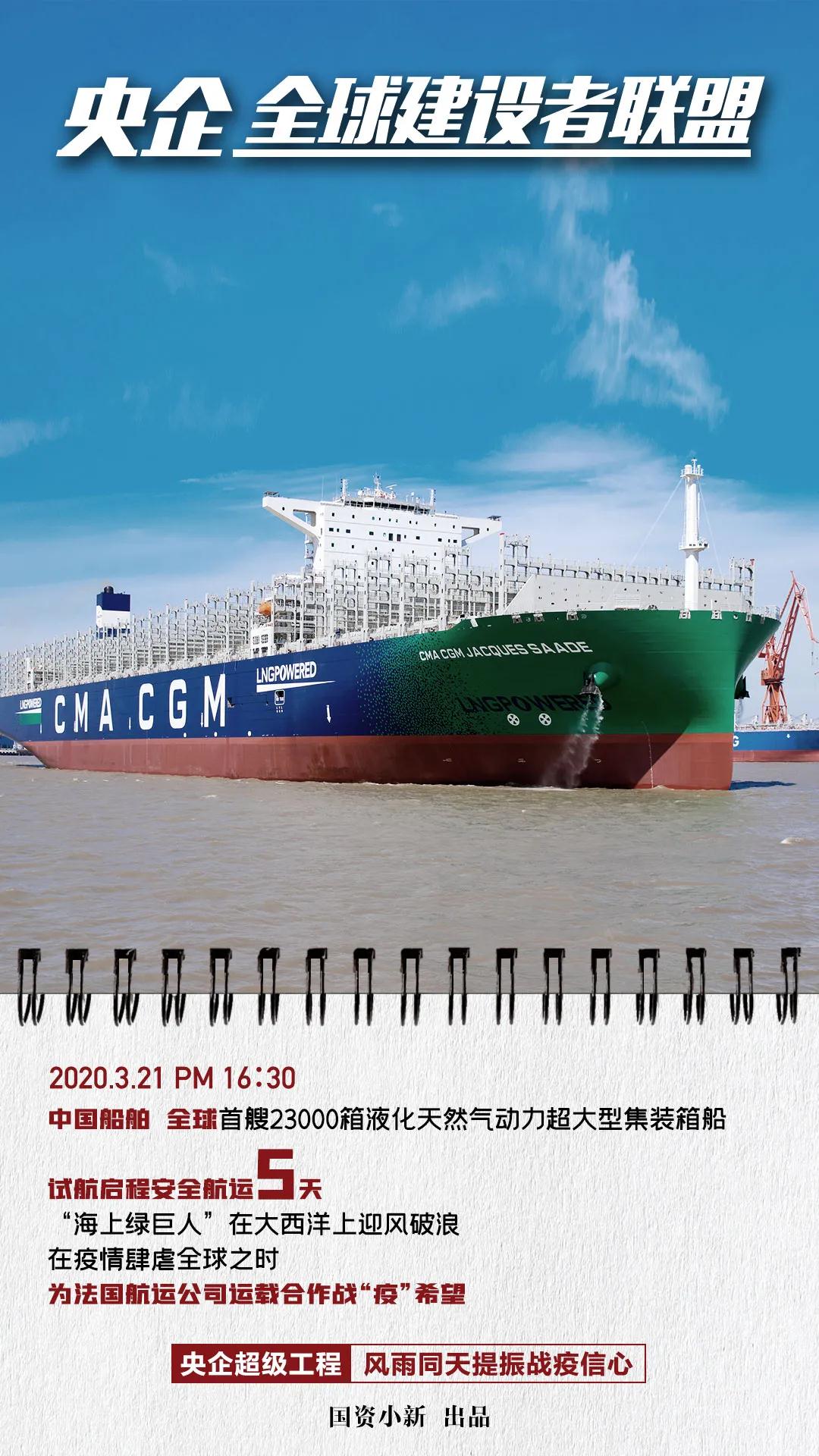 ????今天,國資小新發(fā)布圖文消息《央企全球建設者聯(lián)盟:風雨同天提振國際合作戰(zhàn)疫信心!》。開篇提到中國船舶集團所屬滬東中華建造的全球首艘23000箱液化天然氣(LNG)動力集裝箱船開啟常規(guī)試航之旅,在疫情肆虐全球之時,為法國航運公司運載合作戰(zhàn)“疫”希望。