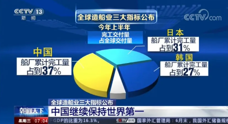 全球權(quán)威航運(yùn)造船機(jī)構(gòu)公布的最新數(shù)據(jù)顯示,今年上半年,全球造船業(yè)三大指標(biāo),中國(guó)再次領(lǐng)先,繼續(xù)保持世界第一的紀(jì)錄。