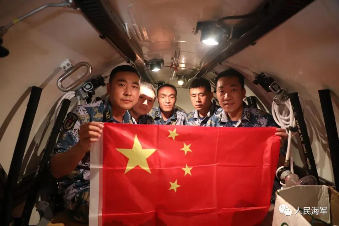 經(jīng)過2個(gè)小時(shí)的緊張下潛,深潛救生艇終于到達(dá),并突破指定極限下潛深度,官兵們展開五星紅旗驕傲地宣布“我的戰(zhàn)位在海底531.1米。