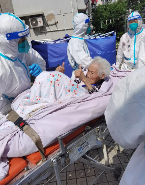 “我們是穿著防護(hù)服進(jìn)去的,突然看到這么多‘大白’,老人們不免有些緊張,問(wèn)的最多的就是‘去哪里’。隨著我們一趟趟幫著老人下樓、上車,老人們開(kāi)始逐漸信任我們。因?yàn)檗D(zhuǎn)運(yùn)的部分老人中存在核酸異常的情況,有些老人還會(huì)時(shí)不時(shí)關(guān)照我們要注意防護(hù)。幫他們送上救護(hù)車時(shí),老人還和我們連聲表示感謝?!碧镅┟髡f(shuō)道。