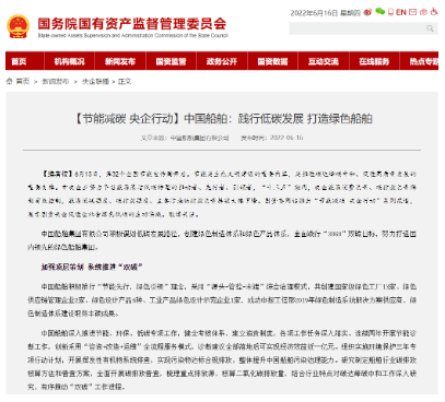 【編者按】6月13日,第32個全國節(jié)能宣傳周開啟。節(jié)能是生態(tài)文明建設(shè)的重要內(nèi)容,是推進碳達峰碳中和、促進高質(zhì)量發(fā)展的重要支撐。中央企業(yè)努力爭當能源清潔低碳轉(zhuǎn)型的推動者、先行者、引領(lǐng)者,“十三五”期間,央企能源消費總量、碳排放總量得到有效控制,能源消耗強度、碳排放強度、主要污染物排放總量持續(xù)大幅下降。6月16日,國資委網(wǎng)站在“節(jié)能減碳 央企行動”系列報道中,展示中國船舶集團有限公司促進社會綠色低碳的生動實踐。